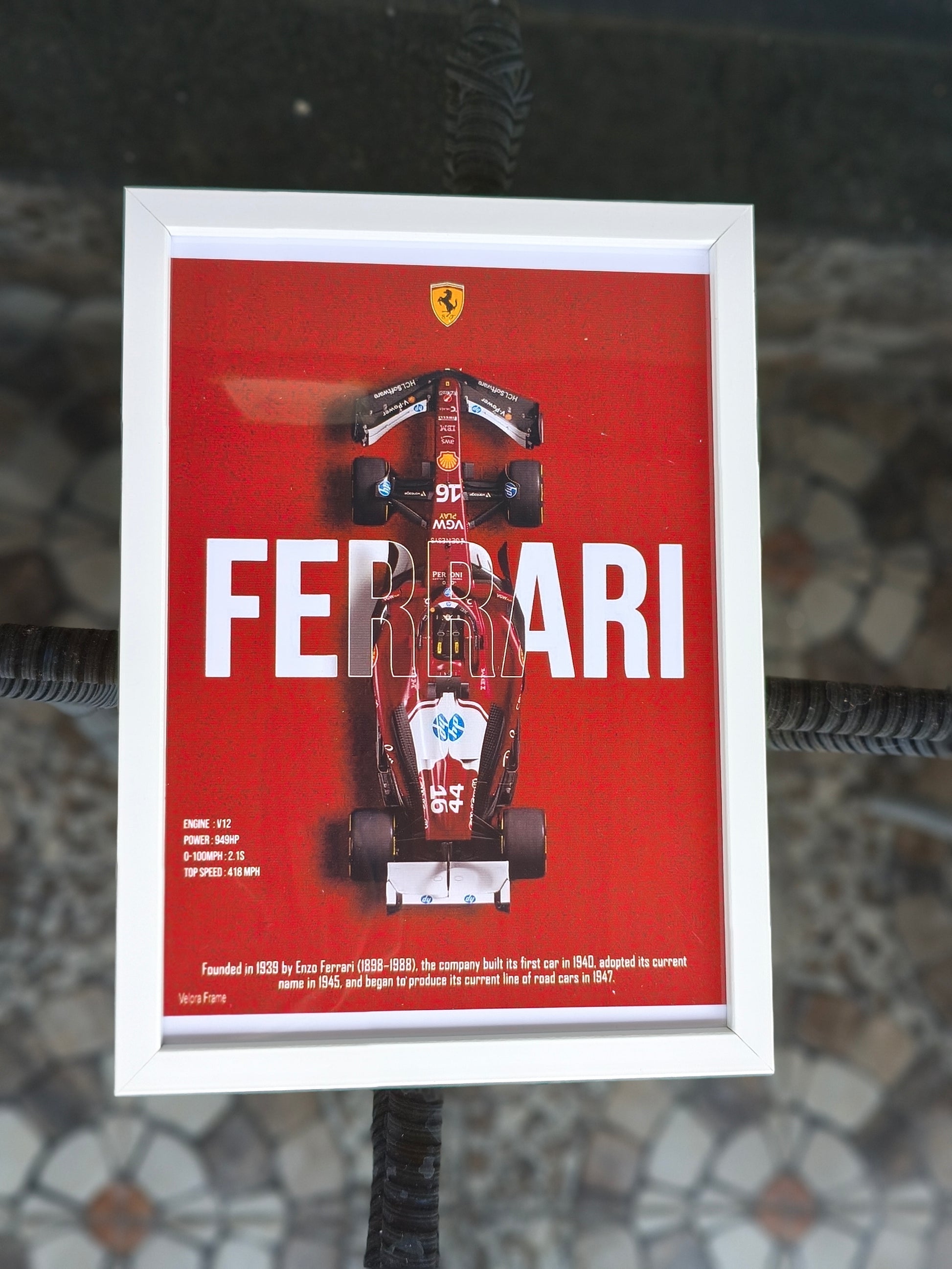 Crafted with a sleek white border and premium print quality, this frame is perfect for motorsport fans, car lovers, and collectors who want to showcase their passion. A true symbol of speed, innovation, and Ferrari pride, this frame adds elegance and energy to any space.