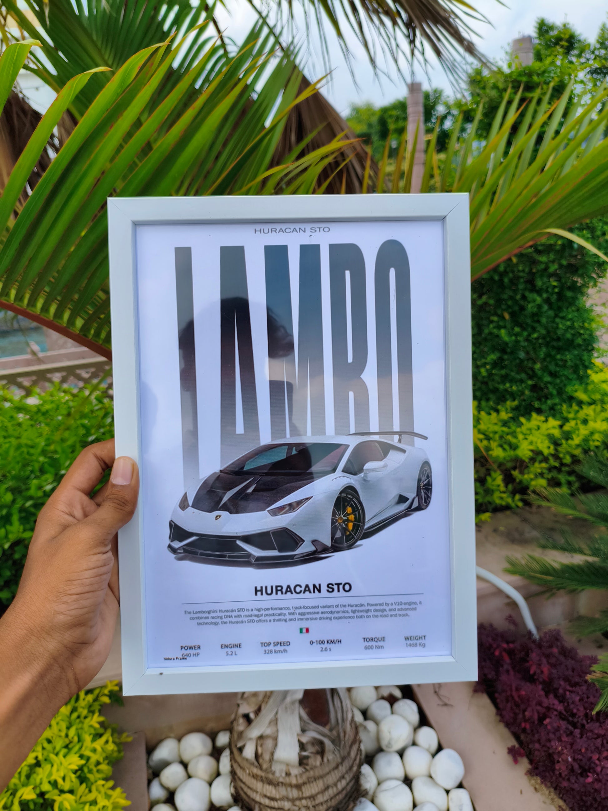 This premium photo frame features the legendary Lamborghini Huracan STO, a masterpiece of speed, design, and innovation. The sleek artwork captures the aggressive styling of the Huracan STO, making it a perfect collectible for supercar lovers and enthusiasts.