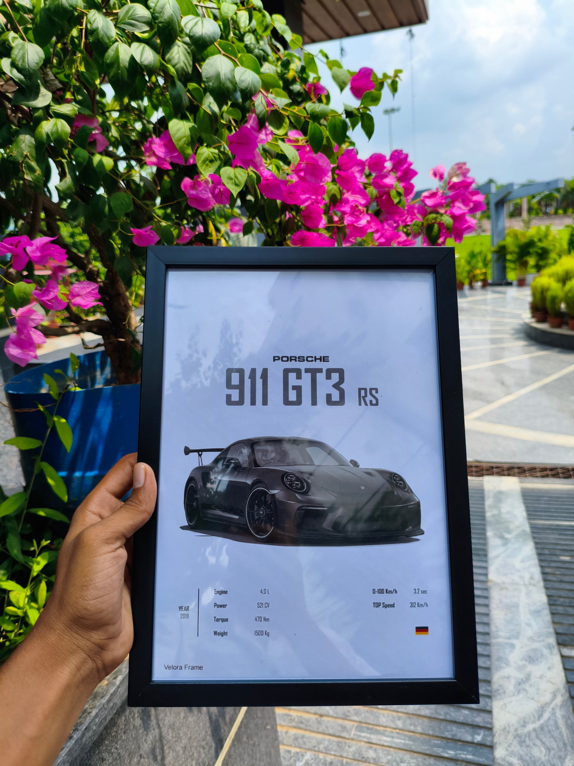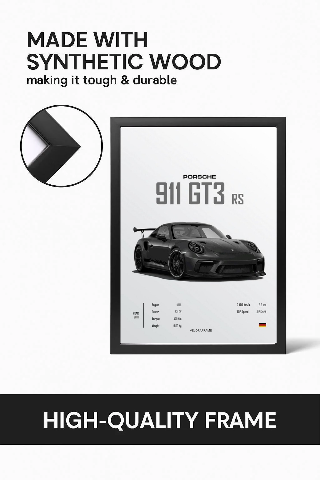This premium-quality frame highlights the black 911 GT3 RS in stunning detail, making it the perfect addition to your living room, office, bedroom, or garage.