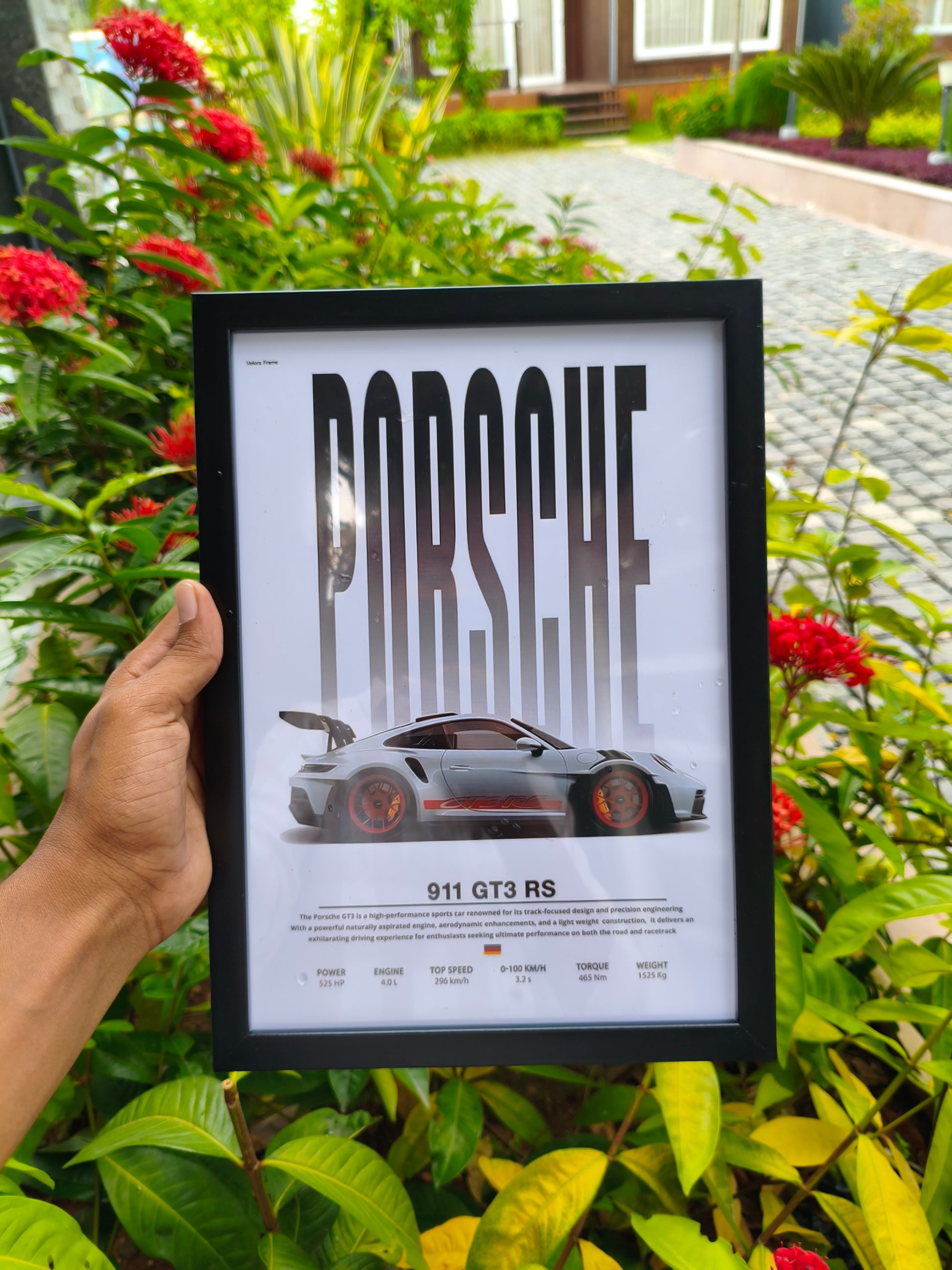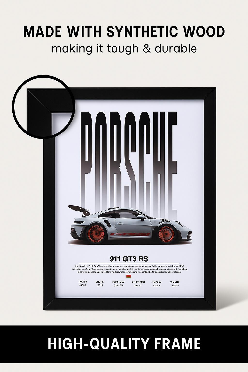 This premium frame showcases the legendary Porsche 911 GT3 RS, a masterpiece of engineering and design. Known for its track-focused performance, aerodynamic precision, and unmistakable style, the GT3 RS is the ultimate symbol of speed and luxury. The artwork captures the car in stunning detail, making it a must-have for supercar enthusiasts.