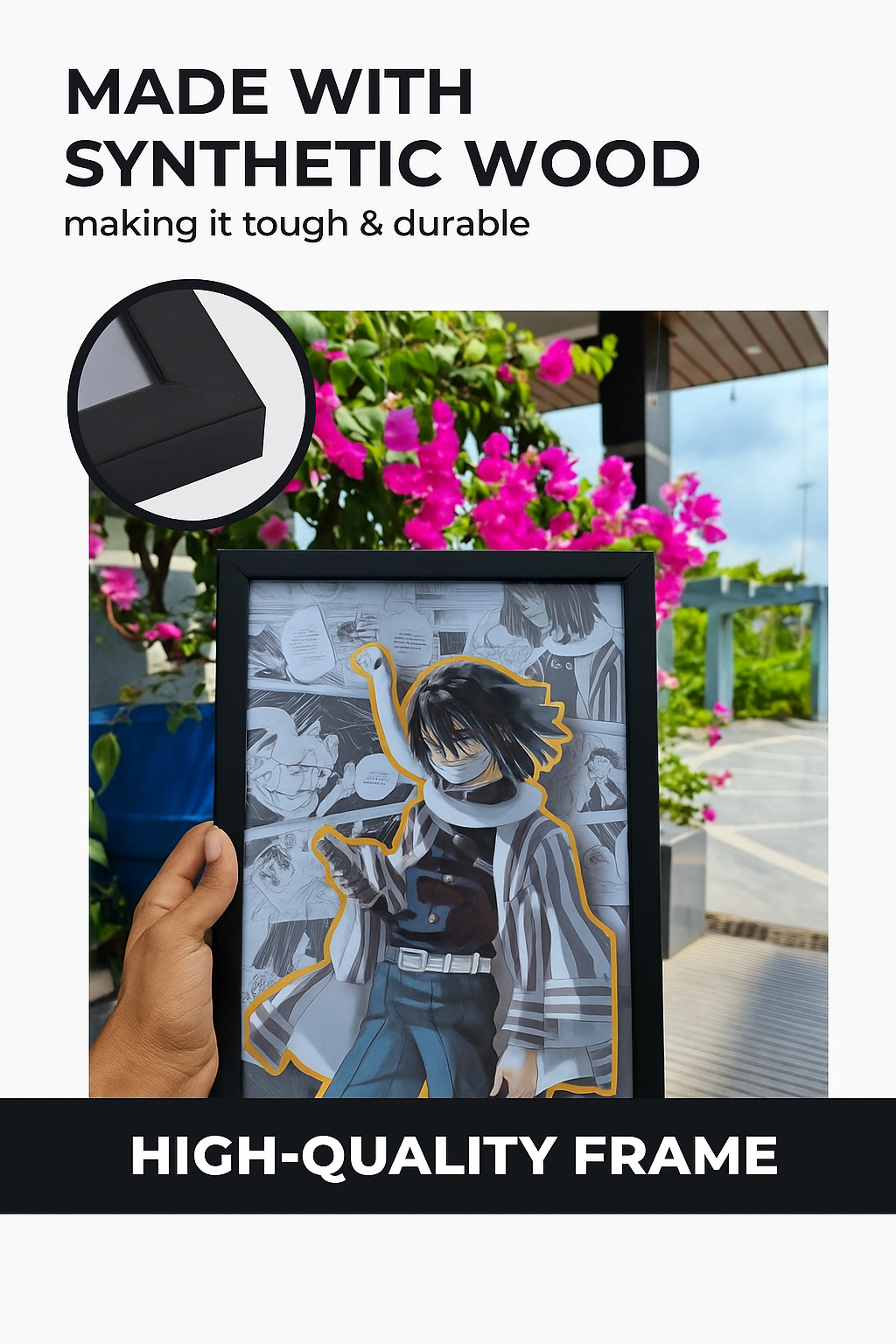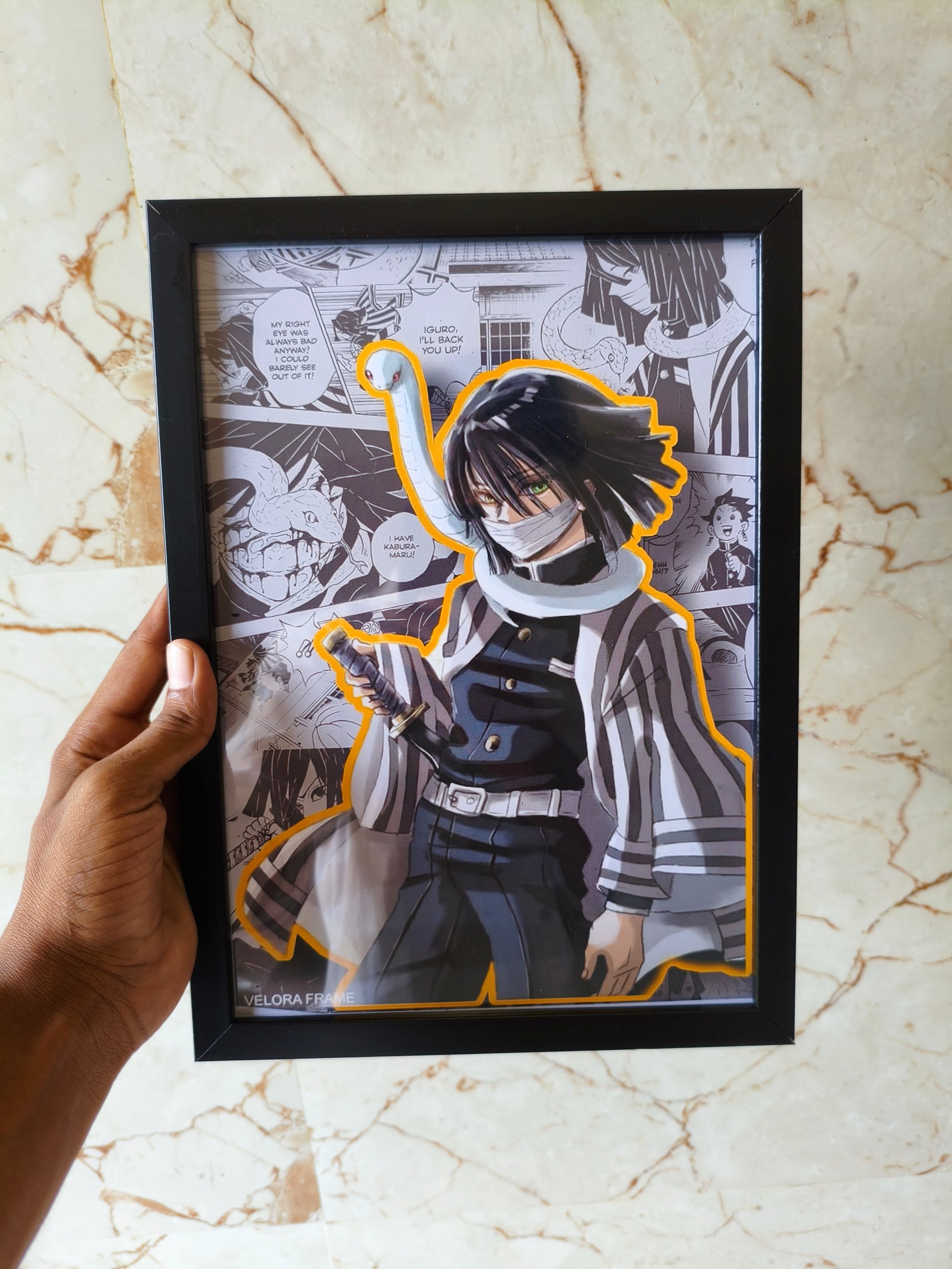 Bring home the intensity of Iguro Obanai, the Serpent Hashira from Demon Slayer. This frame beautifully combines his iconic look with a manga-style background, highlighted by bold outlines that make the character pop. A must-have for every Demon Slayer fan, it captures Obanai’s mysterious aura and unwavering strength.
